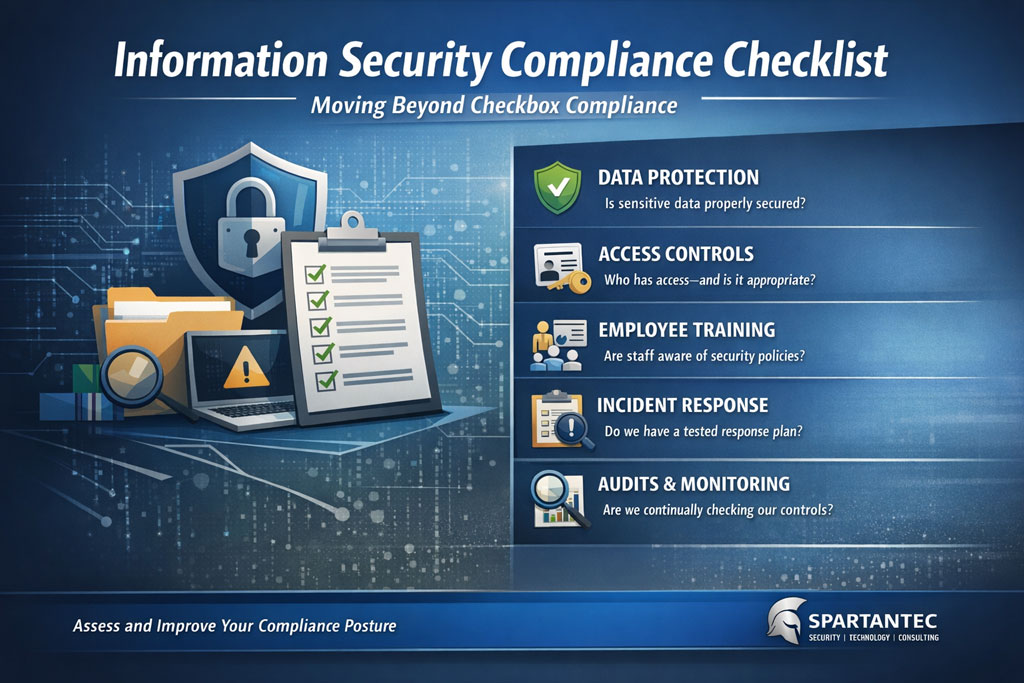 If you’re unsure whether your current compliance efforts reflect your real-world risks, a short conversation can bring clarity. SpartanTec also offers a practical Information Security Compliance Checklist to help organizations identify gaps and prioritize next steps.